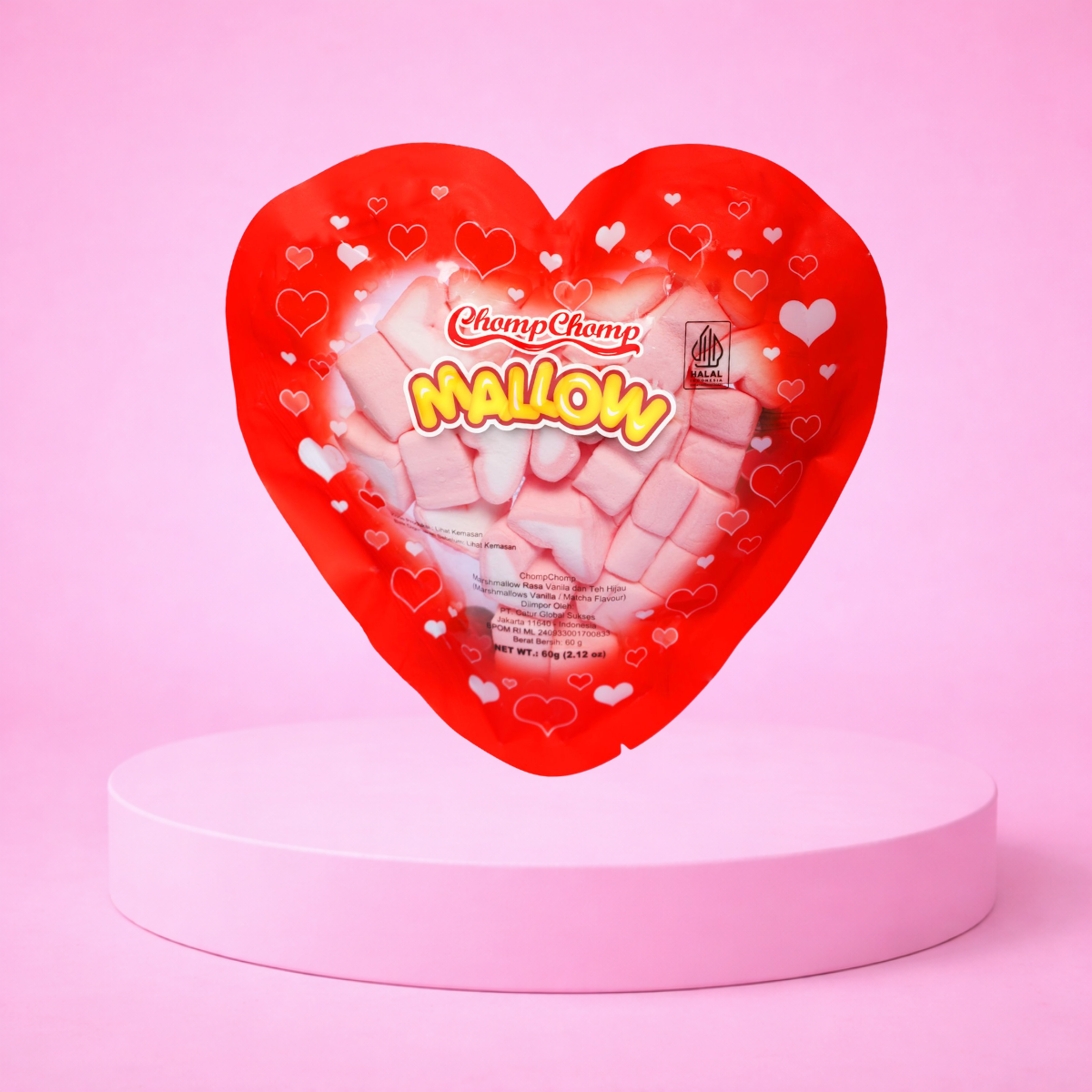 Marshmallow Chompchomp, sebuah produk marshmallow impor yang telah meraih sertifikasi halal dan terdaftar resmi di Badan Pengawas Obat dan Makanan (BPOM), menghadirkan kelezatan yang tak tertandingi. Salah satu variannya yaitu Love Mallow hadir dalam bentuk Hati yang menarik dengan rasa vanila yang lezat.