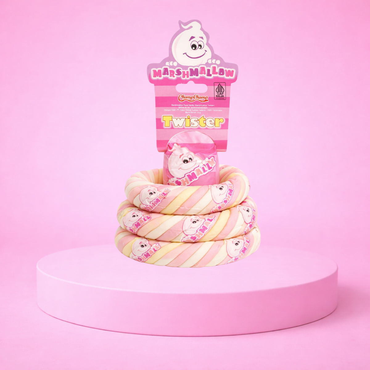 Marshmallow Chompchomp, sebuah produk marshmallow impor yang telah meraih sertifikasi halal dan terdaftar resmi di Badan Pengawas Obat dan Makanan (BPOM), menghadirkan kelezatan yang tak tertandingi. Salah satu variannya yaitu Twister Mallow hadir dalam bentuk kepang yang menarik dengan rasa vanila yang lezat.